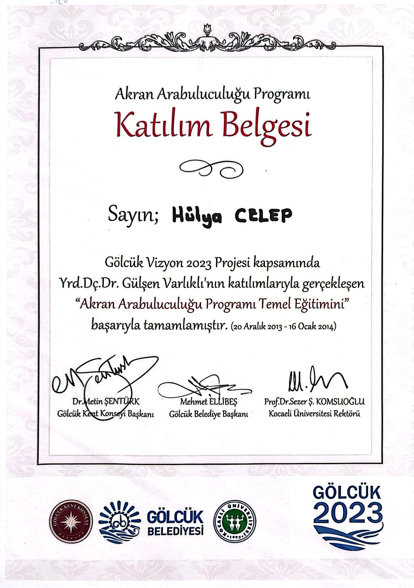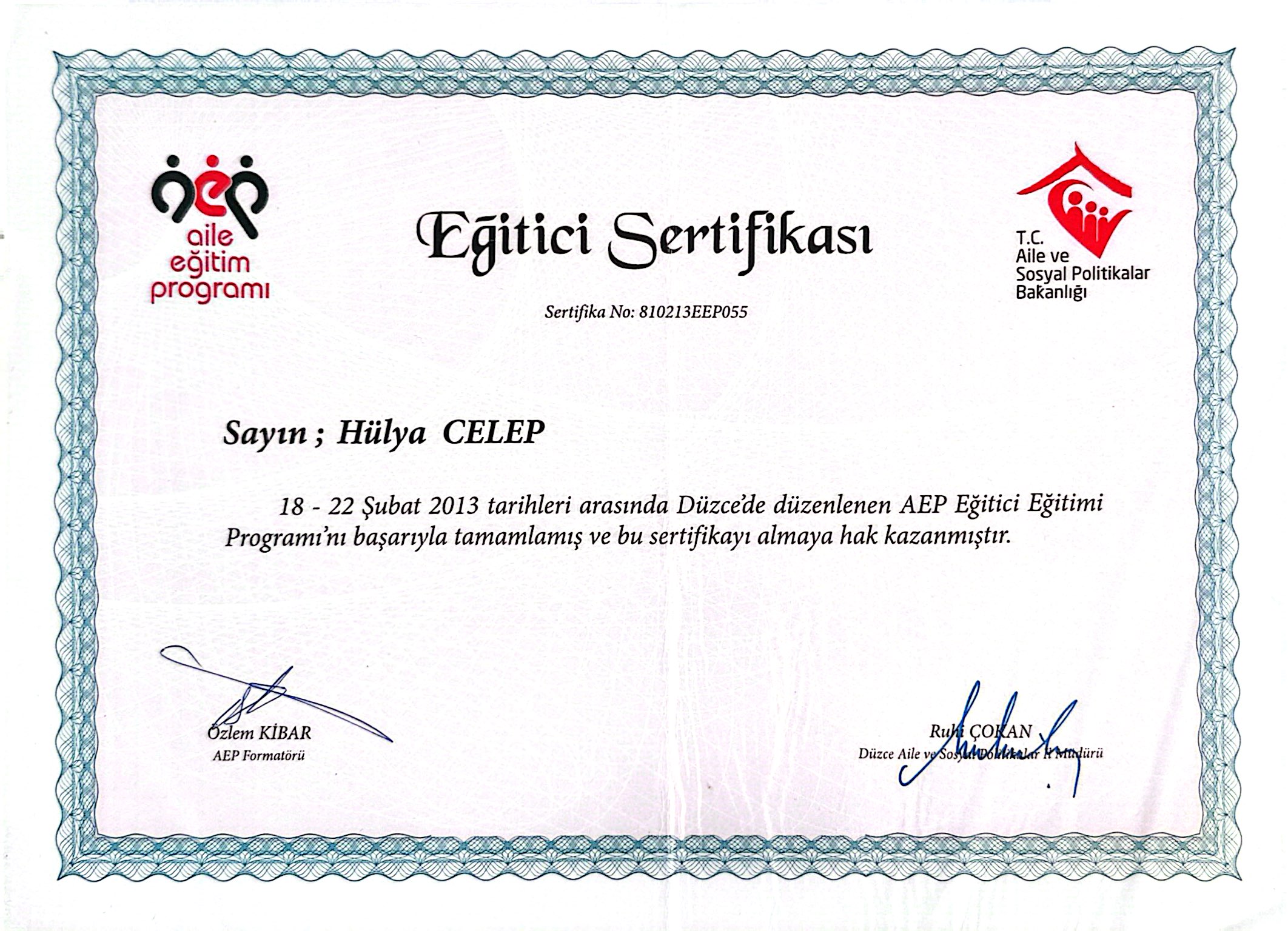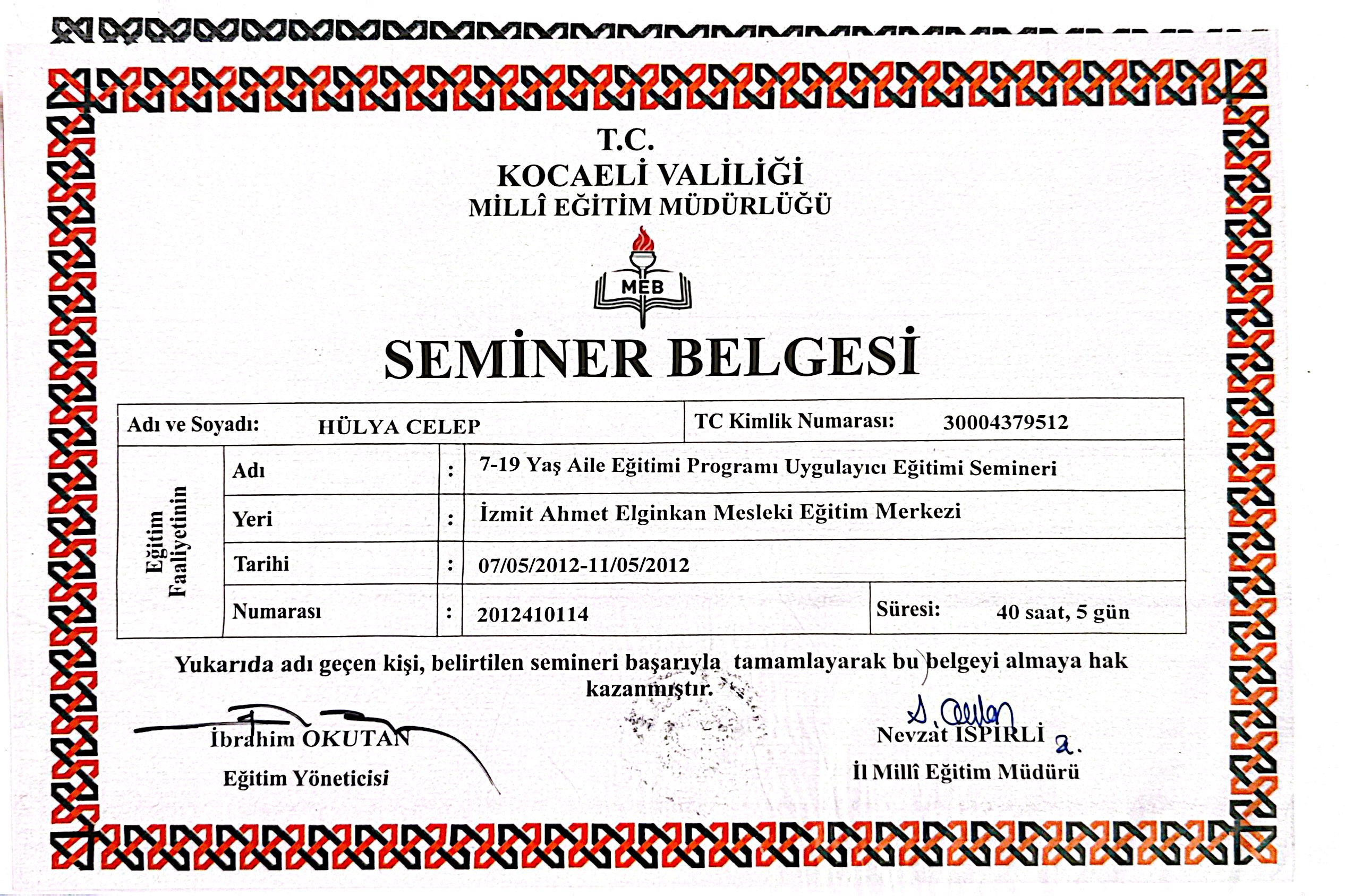 - Aile Danışmanlığı Eğitimi Sertifika Programı Hasan Kalyoncu Üniversitesi , 2012
