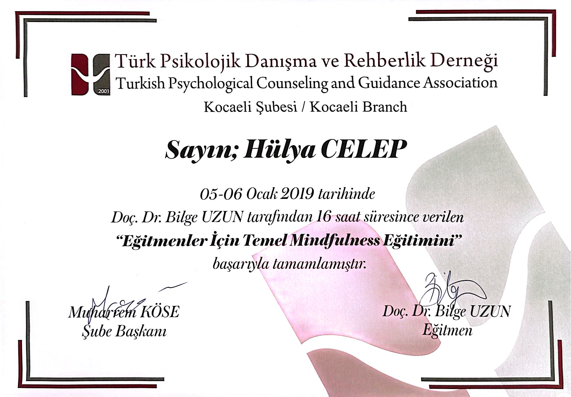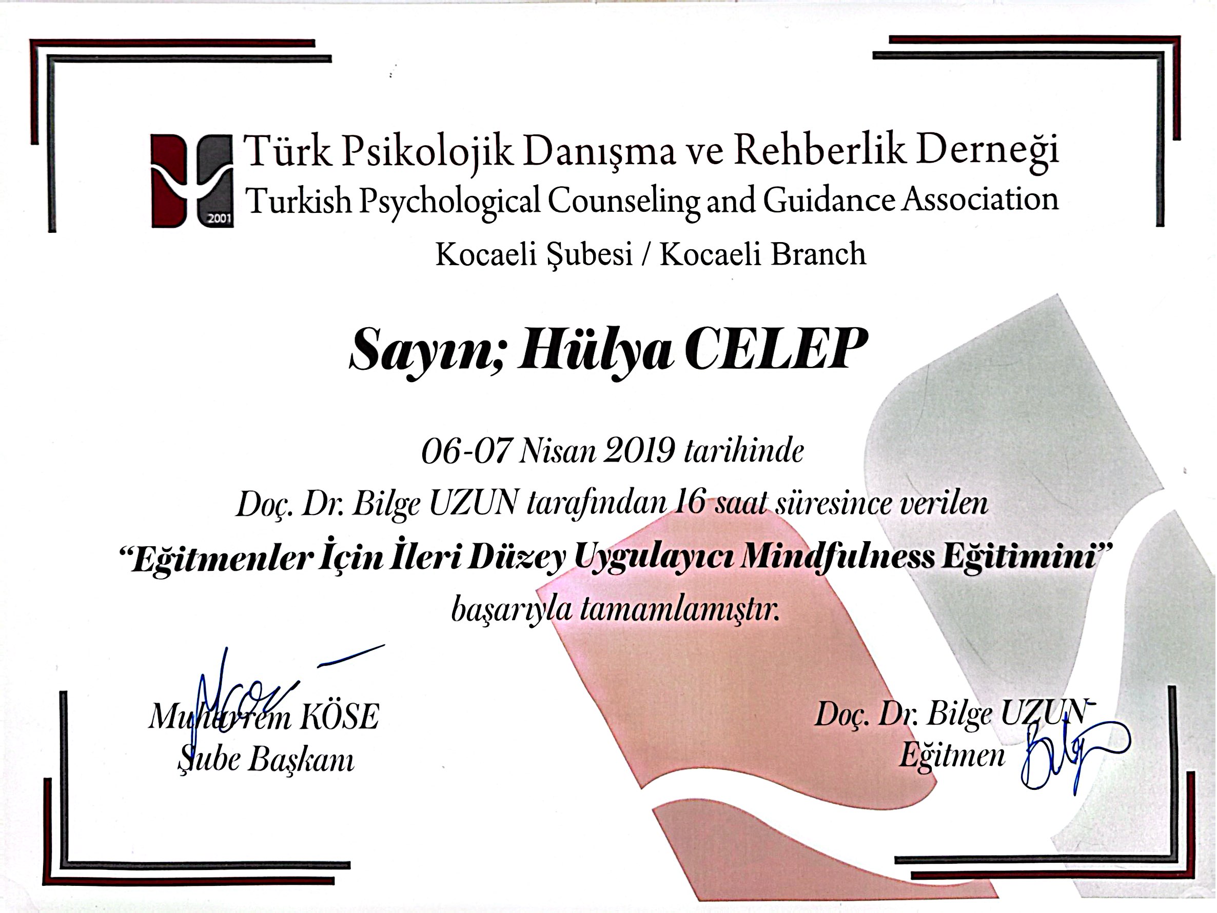 - Eğitmenler İçin İleri Düzey Mindfulness Eğitimi (Doç. Dr. Bilge Uzun) 2019