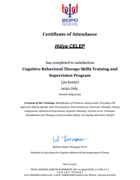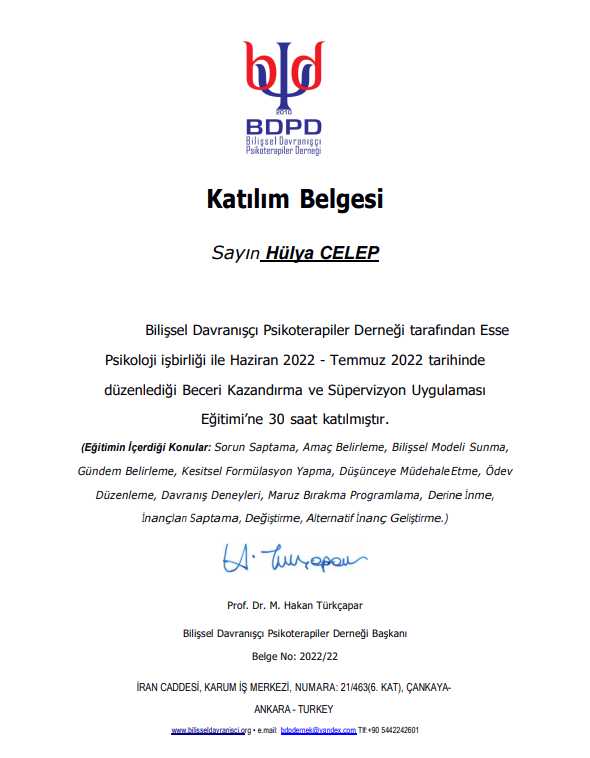 - Bilişsel ve Davranış Terapileri Eğitimi Prof. Dr. Hakan Türkçapar BDPD Beceri Kazandırma ve Süpervizyon Uygulaması 2022